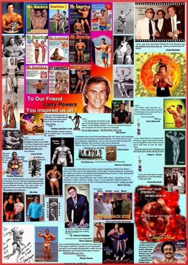 Note: In September of 2009, a group of bodybuilders and fans visited Larry Powers at his Fort Lauderdale home in Florida. It was a special tribute to a man who brought so much to the sport he loved. An ailing Powers showed his gratitude as best he could by thanking everyone for their time and effort. During the visit, Larry was presented with the below poster (26” X 36”), which was created by Denie. The poster had well wishes from many of Larry's friends as well as images of good times gone by.